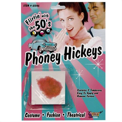 Have fun flirtin' with the 50's with this set of flirty 50's Phoney Hickeys. This set contains 2 temporary easy to apply and remove tattoos. Making out at the drive-in went too far... what will daddy say? This is a great accessory for your 50's Poodle Adult Costume. Dimensions: 1.75"L x 1.25"W